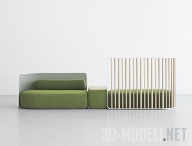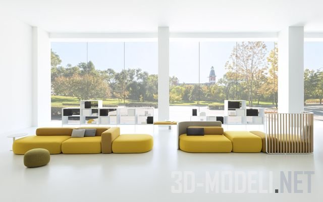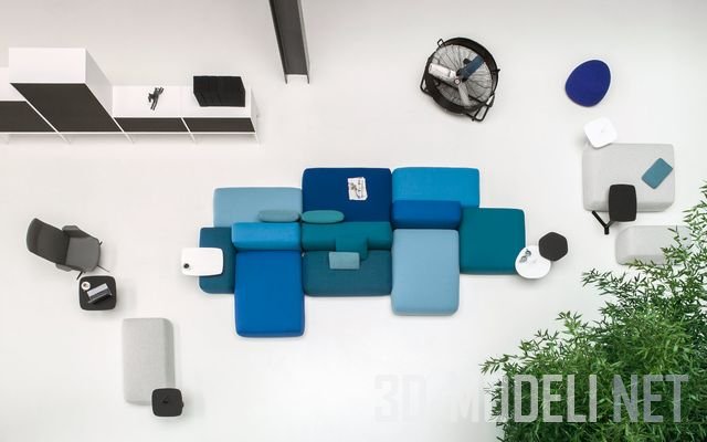 система модульной мебели, которая очень эффективна и функциональна. Такая мебель особо приветствуется в офисе на открытом пространстве, для создания зон коммуникации и отдыха. Дизайн разработан Франческо Рота (