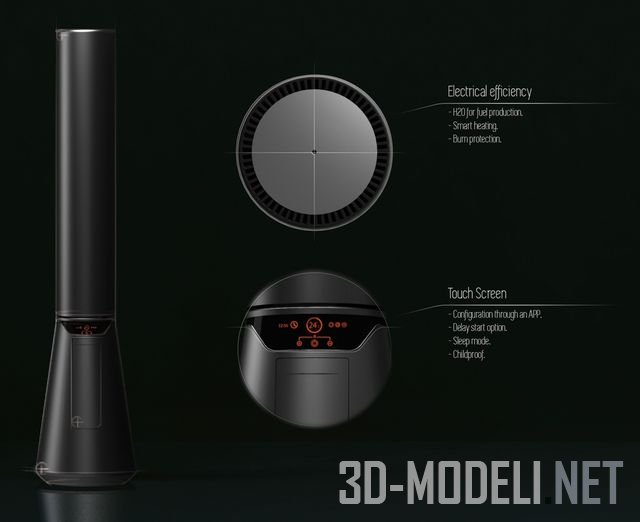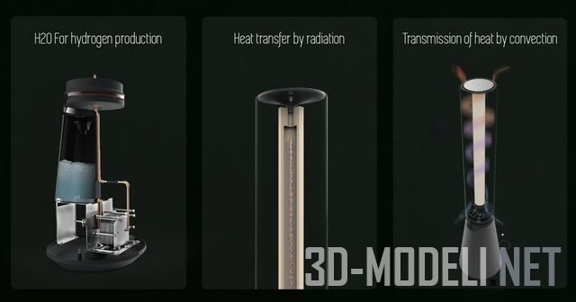Конструкция AWA генерирует тепловую мощность посредством электролиза, разрушая связи в молекулах воды и затем сжигая выделенный водород. Горячий воздух поднимается вдоль корпуса, выделяя тепло через конвекцию, используя вентиляцию, предусмотренную в верхней части. Центральный сердечник, выполненный из огнеупорной керамики, излучает тепло, даже когда камин выключен. А еще этот нагреватель использует на 40% меньше энергии по сравнению с