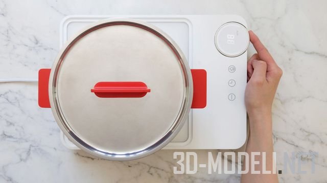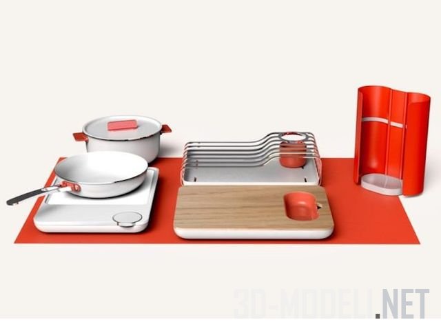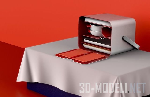 Кухонная плита этой мини-кухни должна была быть не стандартной, а ультратонкой, чтобы другие компоненты могли вписаться в кейс для переноски. Сама плита оснащена имеет белую поверхность с таймером, зажиганием и контролем температуры, Также в корпус кухни входят один горшок, одна мелкая