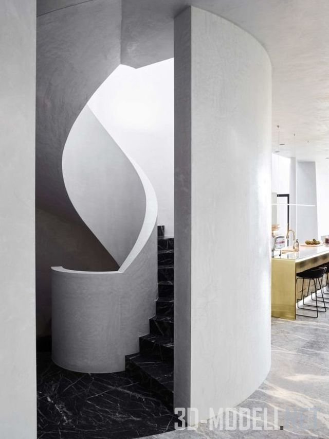 Черно-белая винтовая лестница с круглым просветом представляет собой скульптурный центр, соединяющий уровень первого этажа, который, в свою очередь, служит своей собственной автономной квартирой для гостей и расширенной семьи.