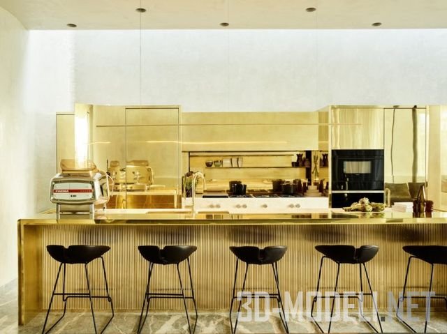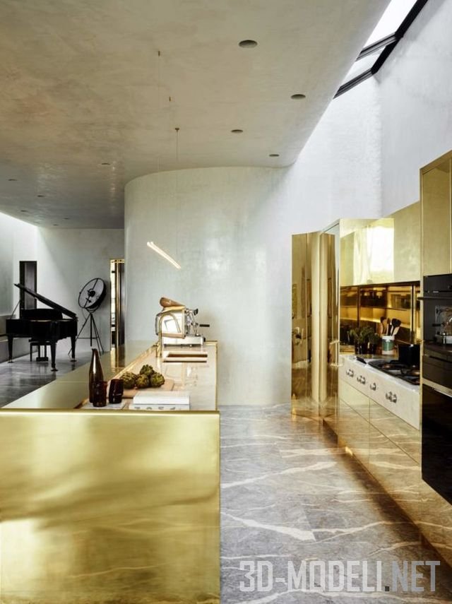 эксклюзивная кухня, почти полностью оборудованная латунью - материал, который ведется по всей остальной части дома в виде освещения и сантехники, вентиляционных решёток, окружающих