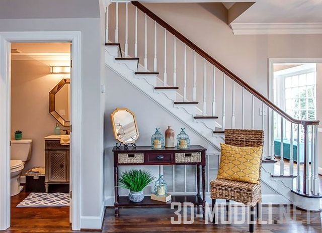 закрытой белой лестницы смелым цветом и рисунком. Это позволит осветить область, давая необходимую сигнатурную полку цвета, которая сразу притягивает глаз. Стул или даже