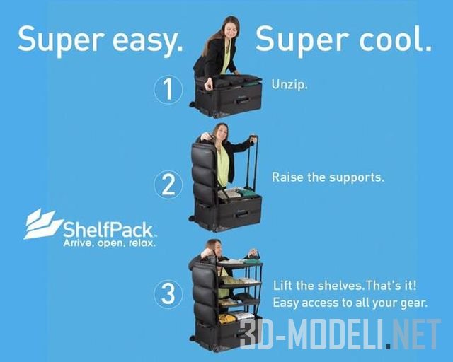 чемодан прибывает в пункт назначения вместе со своим хозяином, остается просто протянуть опоры и повесить полки. Да, это не домашняя