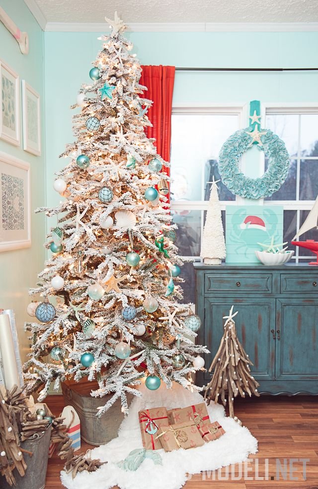 Еще один свежий вариант - это создание почти... пляжной елки! Идеальный прибрежный декор принесет теплую погоду прямо в гостиную, даже когда температура на улице будет горазно ниже нуля. Оттенки бирюзы отлично подойдут для подобного декора.