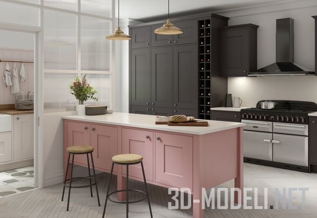 Можно порадовать свою кухню актуальным розовым цветом, и главным акцентом сделать кухонный остров. С