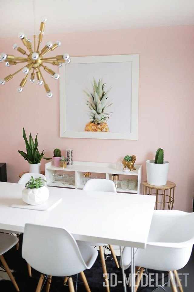 пастельный розовый цвет - это отличный путь к успеху. Пастельно-розовый мягкий и тонкий, что позволяет ему идеально работать с другими декоративными элементами. Кроме того, этот цвет достаточно мягкий, чтобы гармонично вплетаться в белую столовую, не создавая смелых, акцентированных улучшений.