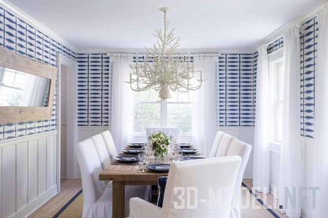 синие стулья вокруг обеденного стола, что, несомненно, сделает белую столовую еще более шикарной.