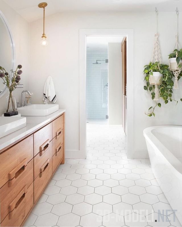 Светлая и просторная ванная комната подходит для тех, кто хочет создать успокаивающее, почти спа-пространство. Добавление подвесных светильников усилит яркий эффект. Хороший свет и открытая эстетика ванной комнаты поможет сделать интерьер более воздушным.