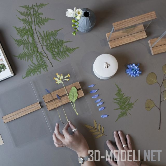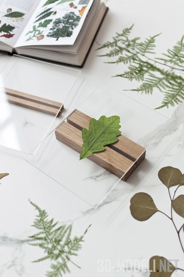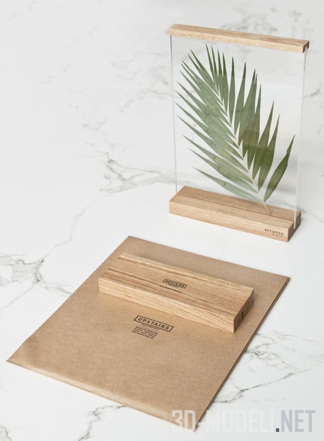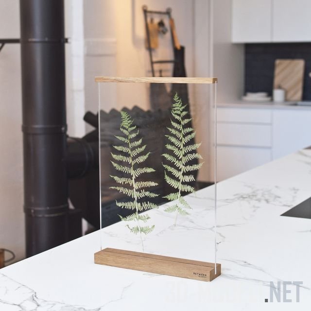 Рамка состоит из двух кусков акрилового стекла и двух элементов, изготовленных из цельного промасленного дуба. Дубовые части скрепляют стекло и дают возможность создать собственную декоративную композицию между ними.