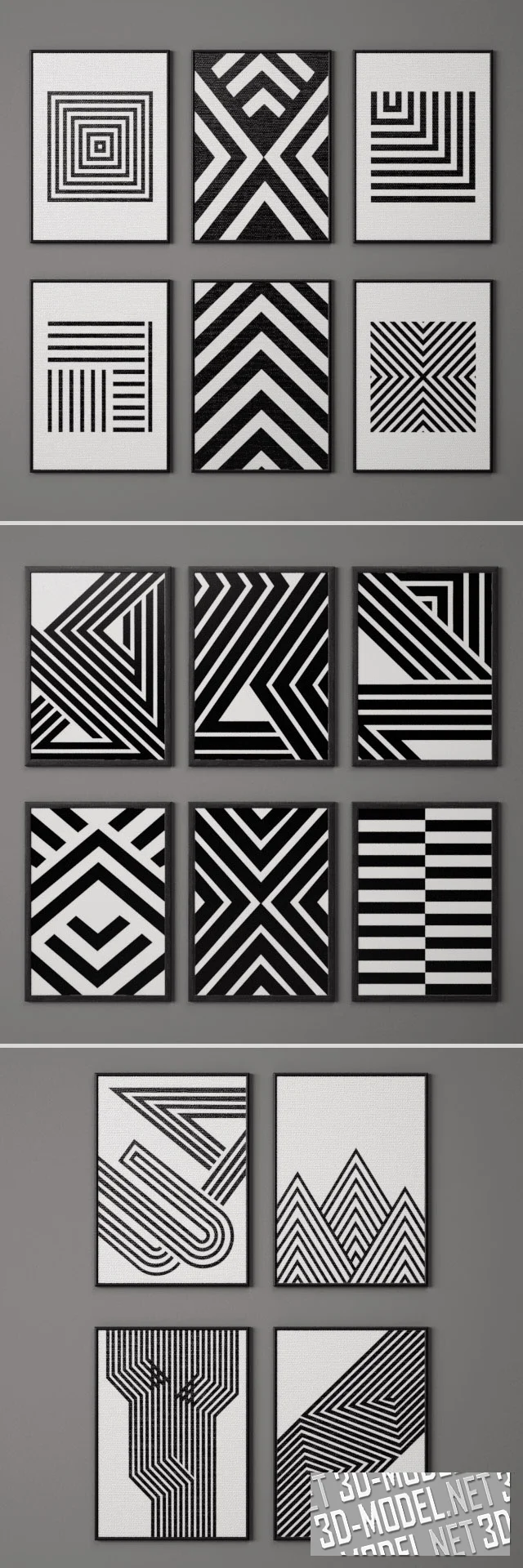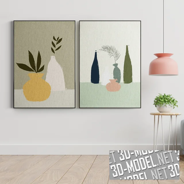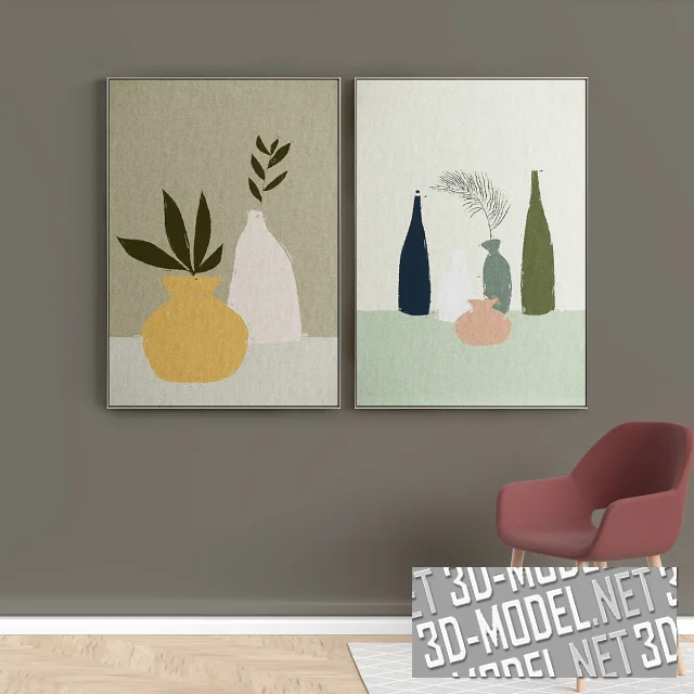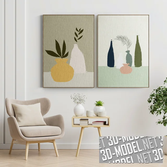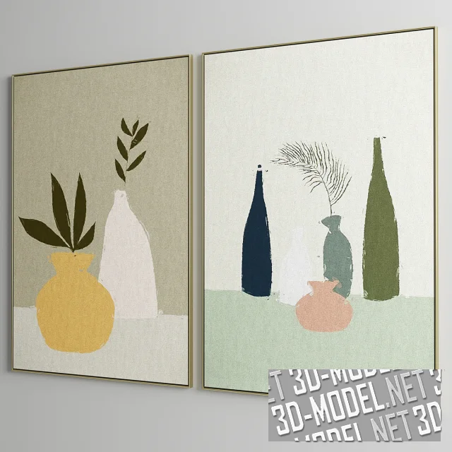 В комплект входят две модели с пятью вариантами материалов рам: два деревянных и три металлических. Высокое качество текстур с разрешением 2700х1890 пикселей позволяет использовать трехмерные модели для фотореалистичных визуализаций. Эти картины можно разместить как парно, так и по отдельности, они гармонично впишутся в гостиную, спальню, кабинет или общественное пространство, придавая интерьеру современный и утонченный характер.
