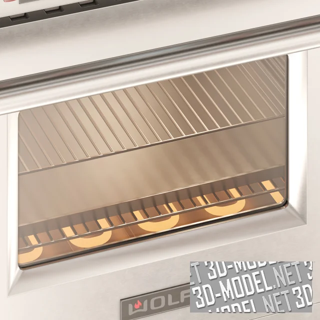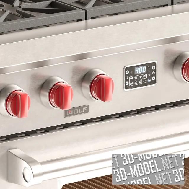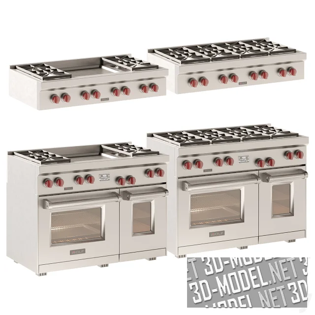 Две модели газовых печей в американском стиле от Wolf. Корпуса имеют длину 122см, что позволяет вместить под поверхностью две духовки (полноценную и укороченную). Отделка - светлый брашированный серебристый металл с красными ручками управления форсунками. Модели отличаются конструкцией рабочей варочной поверхности. В одной поверхность разделена на четыре пары конфорок трех типоразмеров, накрытых четырьмя разделенными решетками. Во второй модели варочная поверхность распределена на квадратную плиту по центру и две пары газовых конфорок под решетками по бокам. Кроме базовой конструкции чугунных решеток с лучами, расходящимися от центров конфорок, печи дополнены еще двумя вариантами (с частыми прямыми или поперечными перемычками).