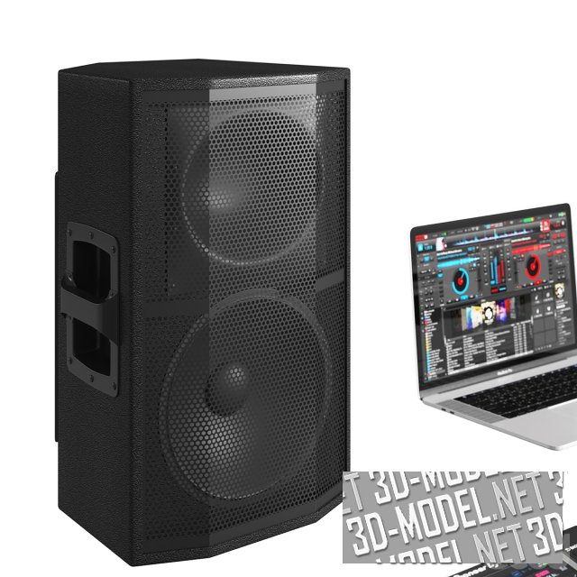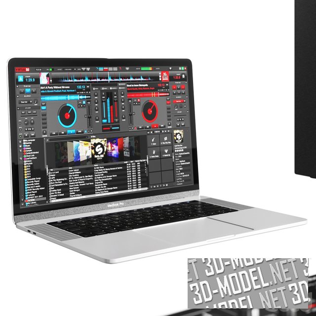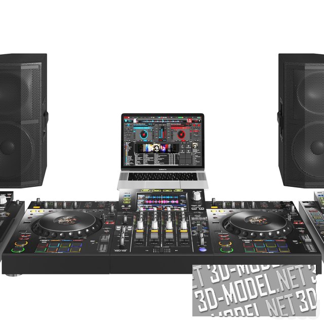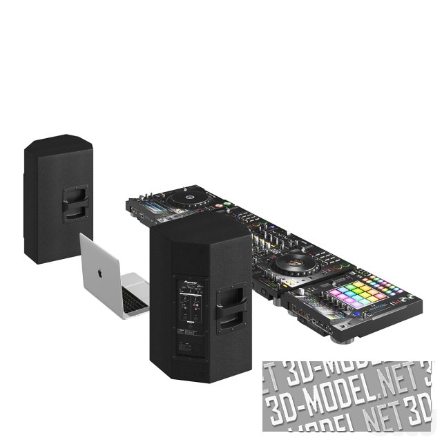 Современная аппаратура для диджея от Pioneer. В наборе: пара черных акустических колонок с ручками для удобной транспортировки, Макбук с музыкальным редактором на мониторе, DJ-контроллер Pioneer DJS-1000, мультиплеер Pioneer CDJ-2000NXS2 и DJ-система «все в одном» Pioneer XDJ-XZ.