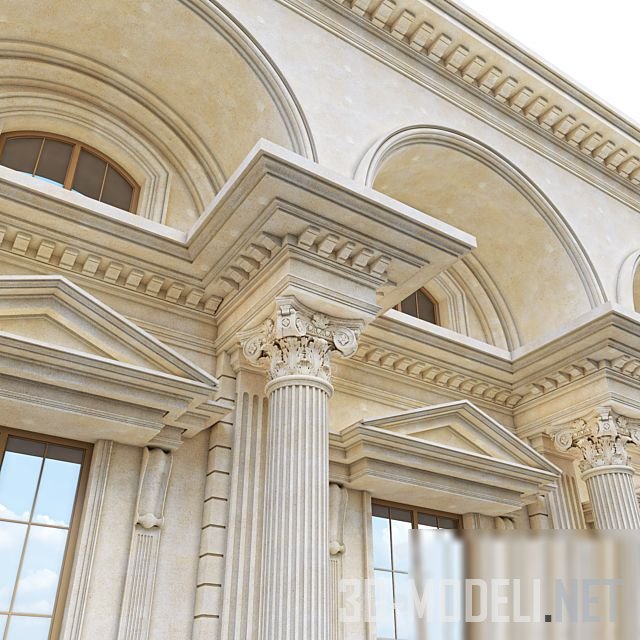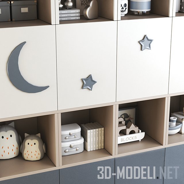 Открытые полки наполовину повторяют арку, небольшие круглые открытые секции вносят игривую нотку в дизайн мебели. Симметрично расположенные шкафы также имеют в нижней части открытые секции для коробок. Фасады помечены надписями «TOYS» «BOOKS». Удобный мягкий стул входит в комплект. Цветовая гамма (голубой и розовый) позволяет с успехом использовать мебель для комнаты как мальчика, так и девочки.