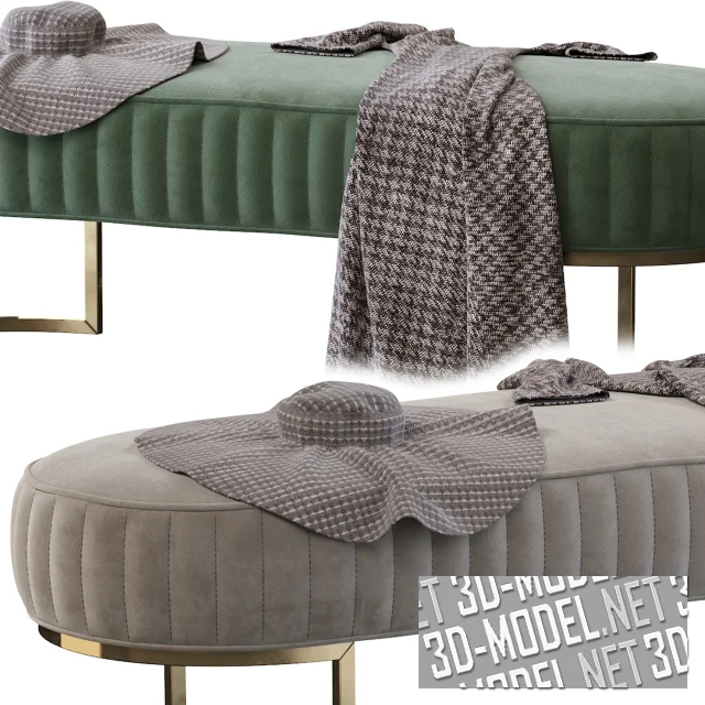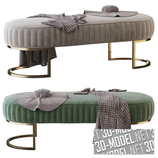 Обивка мягких элементов выполнена из бежевой или кремовой кожи (модели: 2561000L Leather 859, 2561500L Leather 9715), из текстиля с жемчужным блеском и текстиля с дамасским орнаментом в стиле арт-деко (модели: 2560600F Fabric FG09001-5, 2560610F Fabric LS418-1, 2560800F Fabric 603-10A, 2560910F Fabric YS31C-27). Габарит оттоманки: 143х51,8х64,5см.