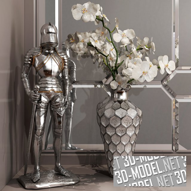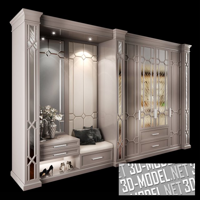 Слева, справа и посредине группы размещены декоративные полуколонны с капителями, зеркальными накладками и молдинговым переплетом на передних плоскостях. Прямоугольные жемчужно серебристые ручки на фасадах, скрытые и встроенные подсветки, фацеты на кромках стекол и зеркал, цоколь и венцы шкафов поддерживают общую концепцию стиля. А изящная женская обувь на полках, ваза с орхидеями, фигурка рыцаря в доспехах на тумбе, черно-серые подушки в бархатных чехлах, лежащие на сиденье наполняют сцену жизнью.
