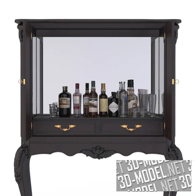 Темный барный шкаф CAVIO в классическом стиле, на высоких резных ножках, с молдингами и резьбой на двух створках и корпусе. Внутреннее пространство разделено на два выдвижных шкафа внизу и на полку с зеркальной задней стенкой в остальном объеме. На полке стоят бутылки с алкоголем, стеклянные стаканы и бокалы. Петли, замок и ручки - металлические, золотистые.