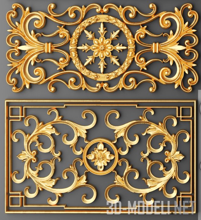 Несколько вариантов лепного декора в барочном стиле золотистого цвета. Орнаменты скомпонованы в прямоугольники. Некоторые заключены в рамки. Используются для декора стен, мебели, потолков.