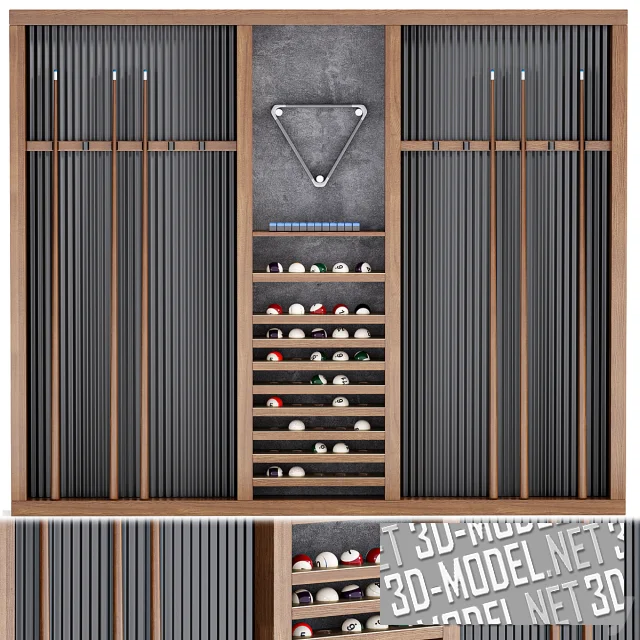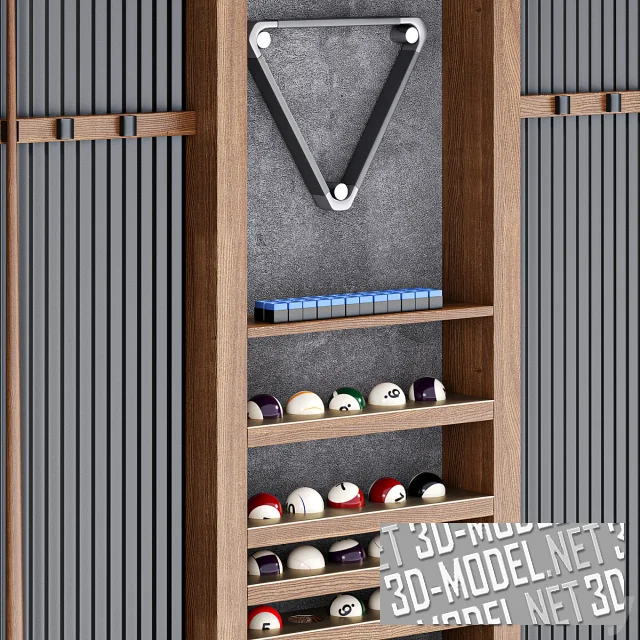 Реалистично созданный с учетом основных параметров оригинала стол для американского бильярда (пул), размер игрового поля составляет 2,5/1,3 м. Сукно зеленого цвета. В сцене предусмотрен игрок, показан в игровой стойке. Рост игрока 190 см.