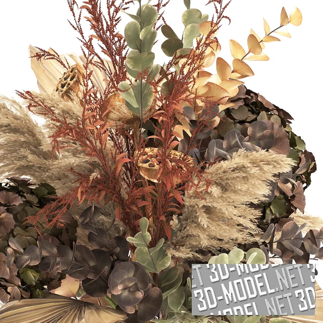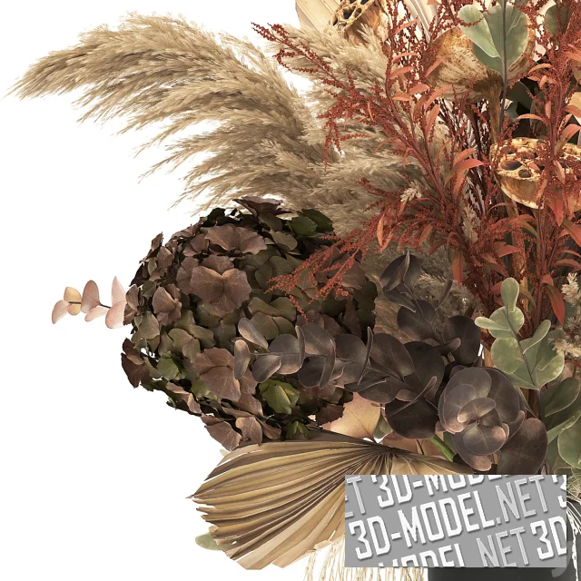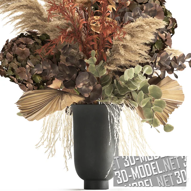 Композиция из сухоцветов в черной вазе MENU CYCLADES выглядит как настоящее произведение декоративного искусства. В букете собраны сухие ветви эвкалипта, пышные соцветия гортензии, перистые метелки пампасной травы и веерные листья пальмы, дополненные акцентами в виде сухих коробочек лотоса и рыжеватых веточек амаранта. Теплая природная гамма оттенков, от мягких зеленых и охристых до терракотово-коричневых, создает атмосферу уюта и осенней гармонии.