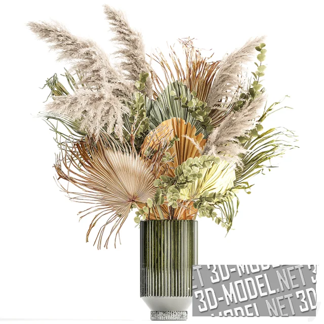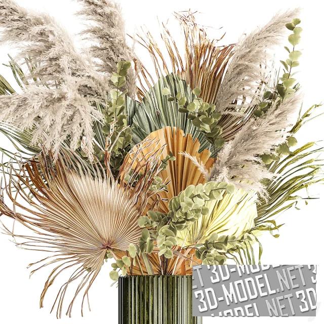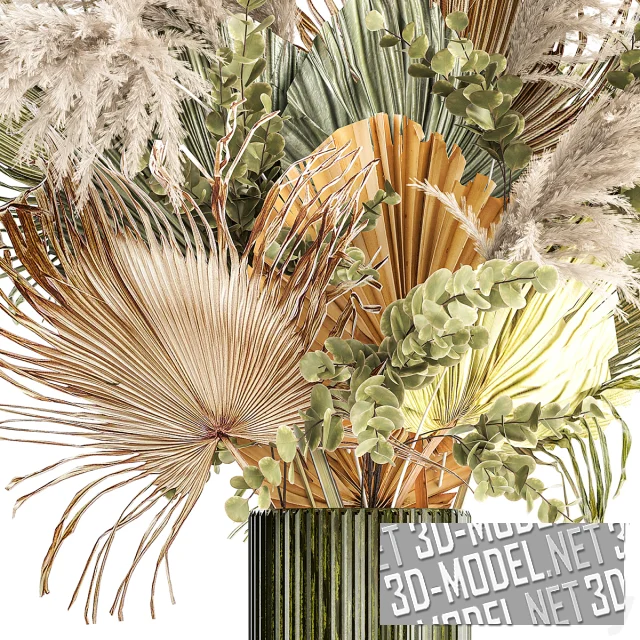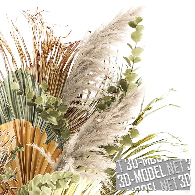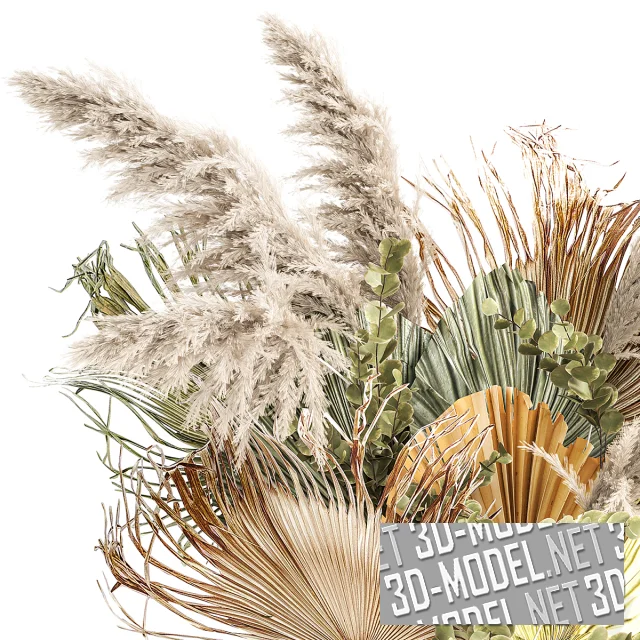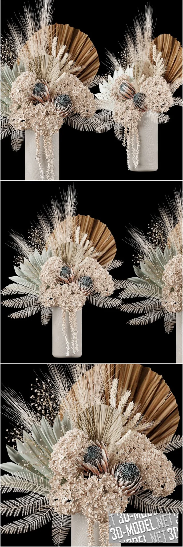 Светлая цилиндрическая керамическая ваза с рустикальной мелкорельефной поверхностью. В вазе - крупный букет из сухих цветов и растений, деликатно подкрашенных пастельными тонами. В букете бледно-розовые с бледно-синими серединами протеи, белые гортензии, сухие, подрезанные, веерообразные пальмовые листья, колосья злаков, ампельные растения, гипсофила и перьевидные, папоротникоподобные белые листья.
