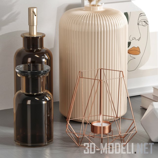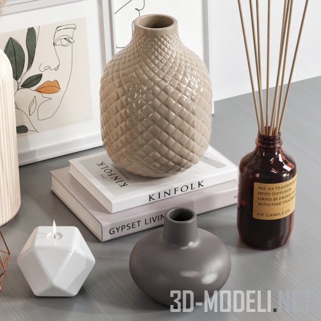 Набор интерьерного декора с букетом сухих метелок тростника в вазе оттенка ванили, подсвечниками, аромопалочками, флаконами темного стекла, парой керамических ваз, книгами, белыми фоторамками. В фоторамках - лаконичные графические работы с портретами, выполненными в технике «одна сплошная линия».