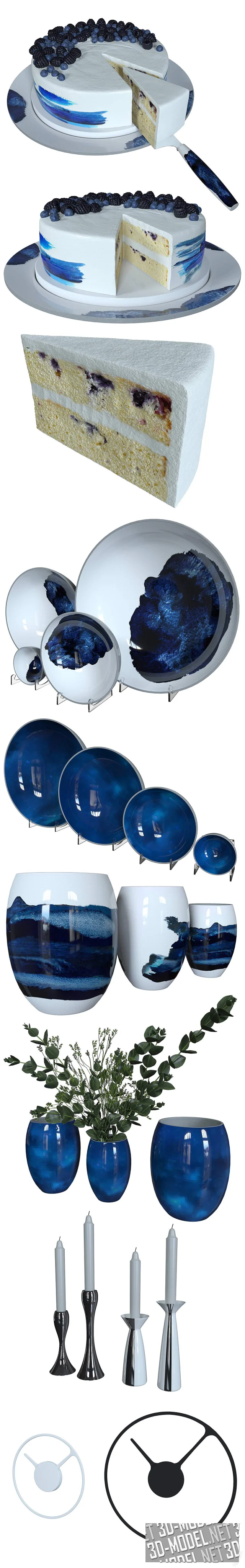 Современный набор посуды, декора и аксессуаров в бело-синих тонах. В сете бело-синий черничный торт с вырезанным куском на бело-синей тарелке, серо-синие и бело-синие тарелки на подставках и вазы (Stockholm Horizon Bowl Medium, Stockholm Horizon Bowl Large, Stockholm Horizon Bowl Mini, Stockholm Horizon Bowl Small, Stockholm Aquatic VASE Large, Stockholm Horizon VASE Medium, Stockholm Horizon VASE Small, Stockholm Aquatic Bowl Medium, Stockholm Aquatic Bowl Large, Stockholm Aquatic Bowl Mini, Stockholm Aquatic Bowl Small), нож Stockholm Cake Knife, минималистичные настенные часы (Stelton Time Wall Clock Black и Time Wall Clock White), подсвечники Reflection Lyesistage Mirror Candleholder и Unified Candleholder.