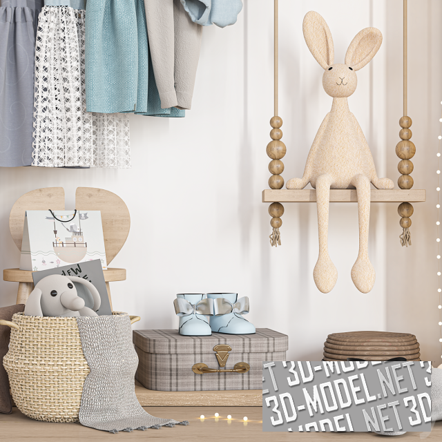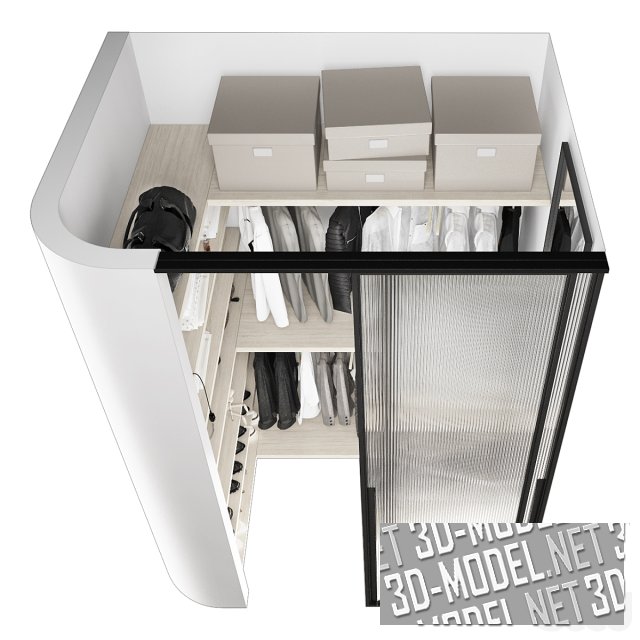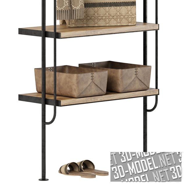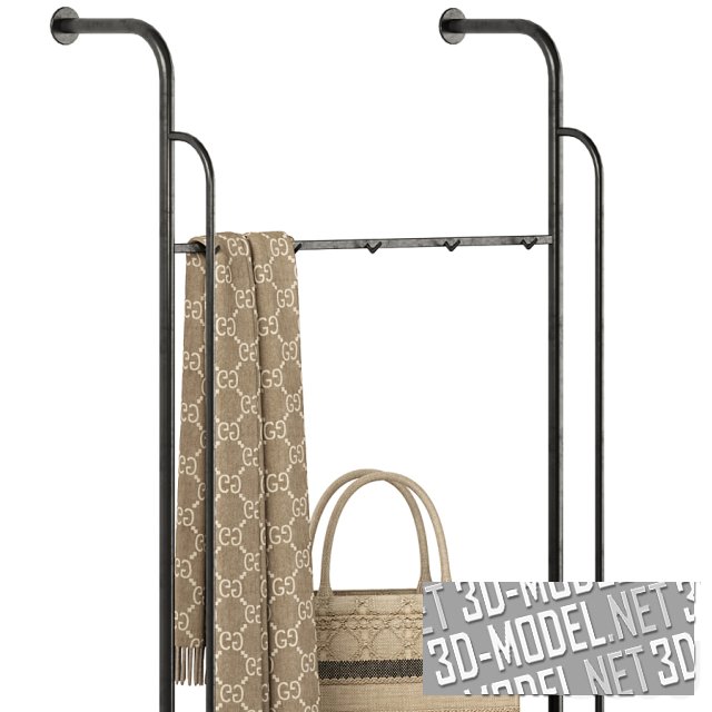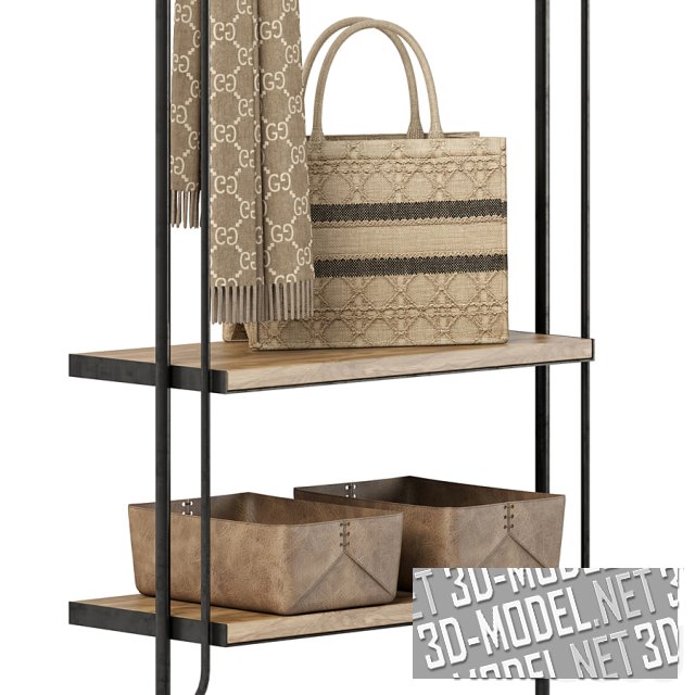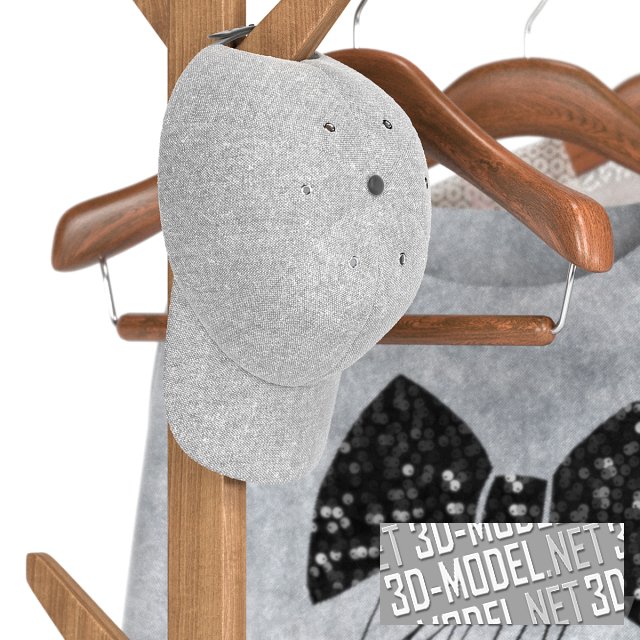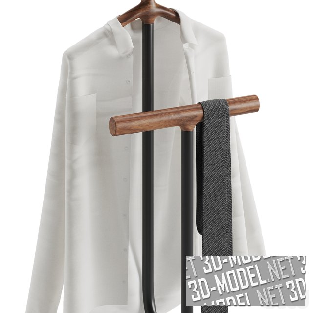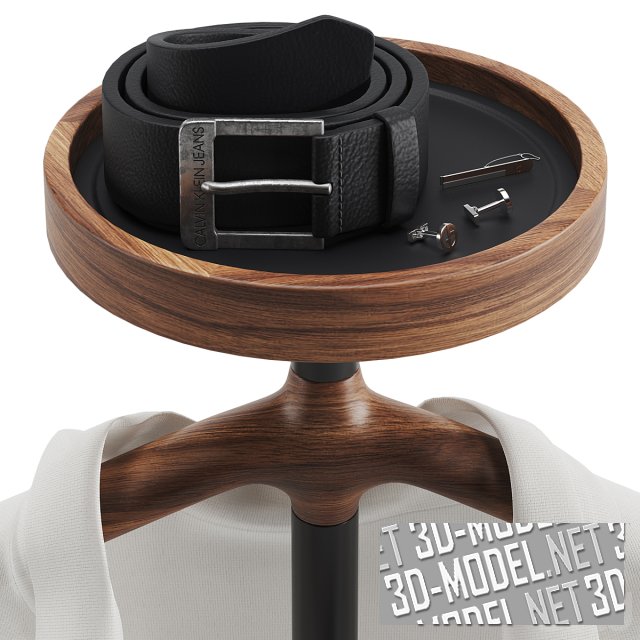 На второй части стойки смонтированы вешалка с белой рубашкой и круглая полка с невысоким бортиком на вершине для мелких аксессуаров (на ней лежит свернутый черный брючный ремень). Плечики вешалки и круглая полка выполнены из полированного дерева. Габарит изделия: 43х30,5х120см.