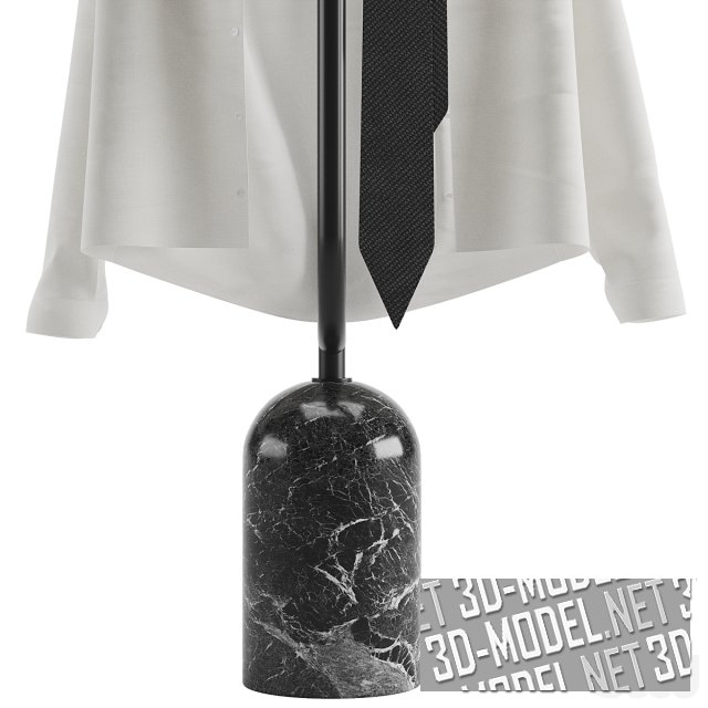 Современная напольная стойка для одежды Ekero rack от Porada (дизайнеры: Staffan Tollgard, Filippo Castellani). Гладкое цилиндрическое основание стойки изготовлено из полированного черного мрамора с белыми прожилками. Скругляясь кверху, опора переходит в спаренную вертикальную стойку из черной трубы. Одна труба оканчивается горизонтальной перекладиной вешалки для брюк из полированного дерева. На ней черный, элегантный галстук.