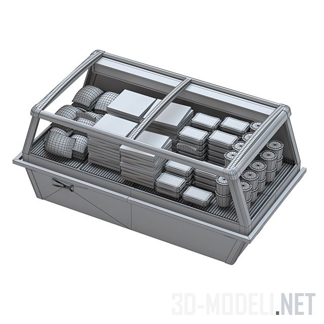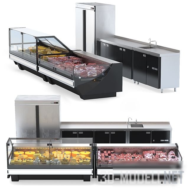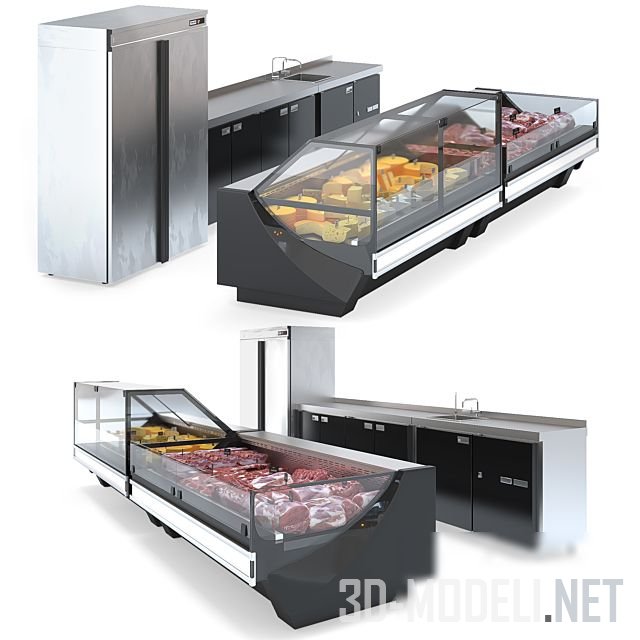Две витрины, один холодильник и два стола для торгового пространства магазина. Размеры оборудования: