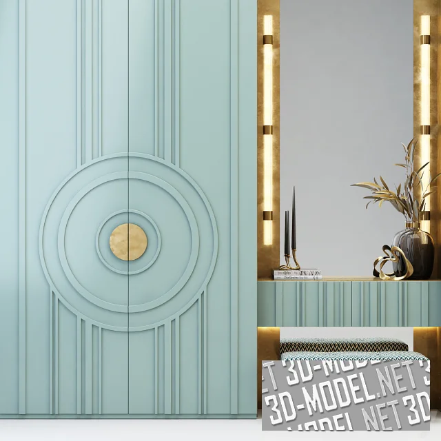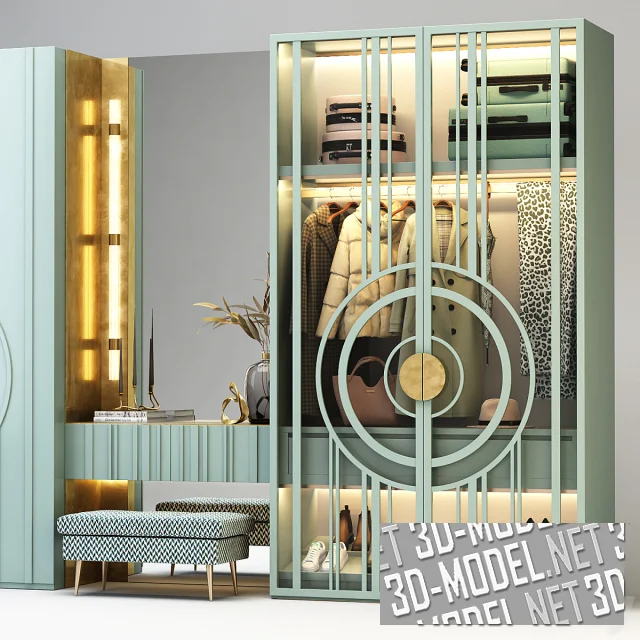 Бледно-бирюзовый современный гардеробный шкаф с аксессуарами и декором. Мебельный блок спроектирован в следующем порядке (слева-направо): платяной двухстворчатый шкаф с глухими декорированными створками, ниша с зеркалом, консольным косметическим столиком и прямоугольным пуфом, платяной шкаф с двумя декоративными фасадами, заполненными прозрачным стеклом.