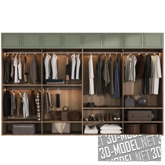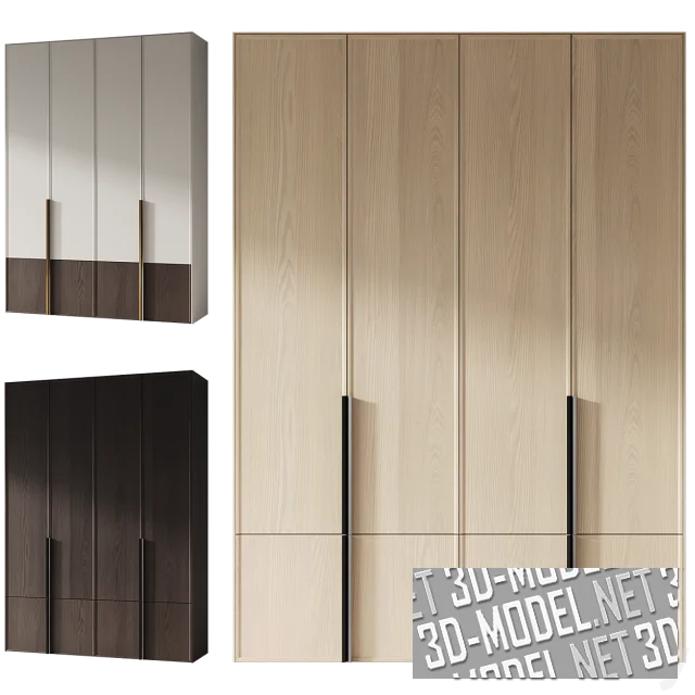 Черный, с текстурой дерева, трехсекционный гардеробный шкаф Verona от Pianca, с шестью створками. Створки двух секций приоткрыты. За ними просматривается наполнение: женская одежда на вешалках, фоторамки с постерами, коробки, прямоугольные корзинки из проволоки, подушки, сложенные сорочки, настольное круглое зеркало на подставке, песочные часы, книги и стеклянная ваза. Габарит шкафа: 424х62,4х257,7см. Деревянные фасады с рамкой из того же материала и имеют перемычку, отделяющую верхнюю четверть плоскости фасада.