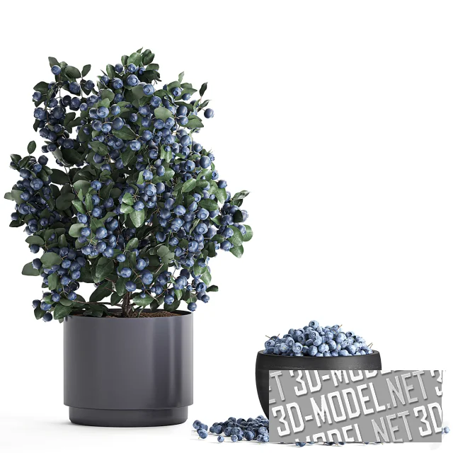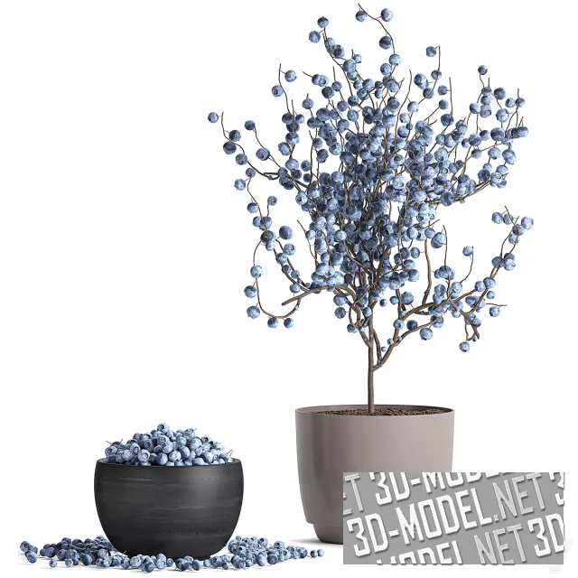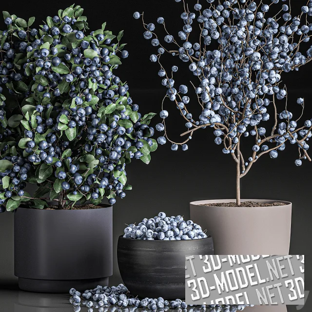 Композиция из элементов интерьерного декора из ягод голубики. Представлены три сосуда. Первые два - матовые цветочные горшки черно-серого и серо-коричневого цвета. В черном куст с веткам, густо усыпанными ягодами и плотными зелеными листьями. В серо-коричневом - небольшое сухое деревце, с множеством ягод голубики на ветках. Третий сосуд - черно-серая глубокая миска, наполненная ягодами. Множество ягод рассыпано вокруг миски.