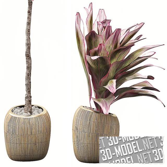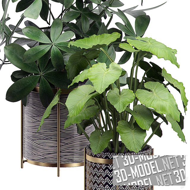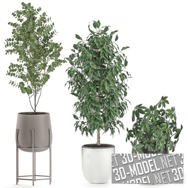 Пять растений (высокий банан, фикус бенджамина, эвкалипты пепельные и шеффлера арборикола) в декоративных цветочных горшках. Три горшка - матовые, графитово-черные, на серых цилиндрических бетонных и на металлической подставках. Горшок у фикуса - белый, с черной кромкой. Под одним из фикусов горшок бледно-бежевый, на высокой подставке из металлических хромированых трубок.