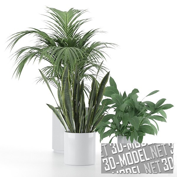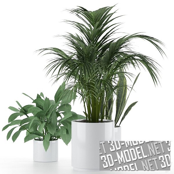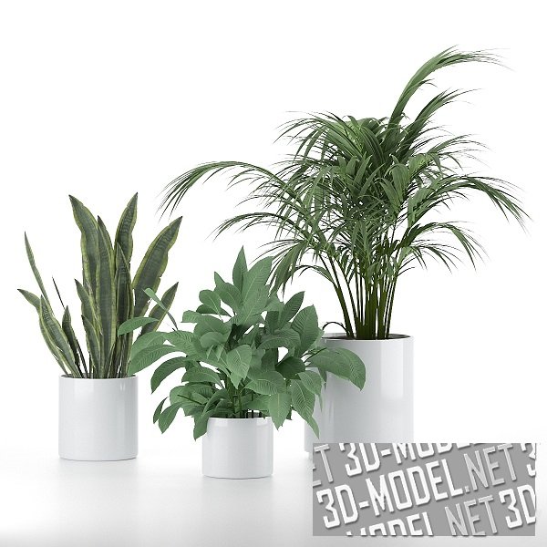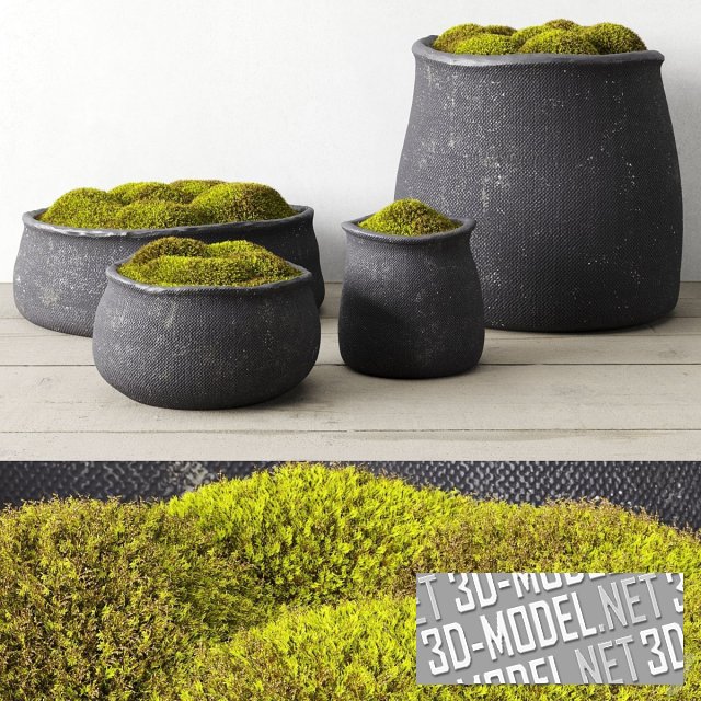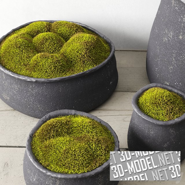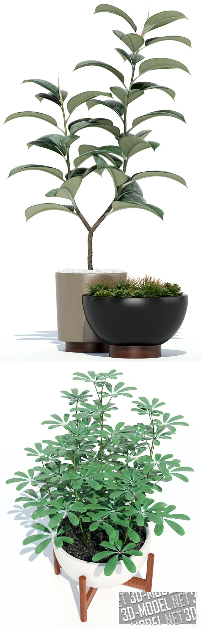 Растения в трех современных горшках от Modernica серии Case Study (модели: Large Cylinder, Small Bowl, Medium Bowl). Крупный фикус эластика разместился в цилиндрическом золотисто-жемчужном горшке на деревянном круглом цоколе. Грунт в горшке декорирован белой галькой. Шефлера посажена в белый толстостенный горшок в виде полусферы на деревянной трехногой подставке. Коллекция невысоких суккулентов разместилась в черной матовой полусфере на круглом деревянном цоколе.