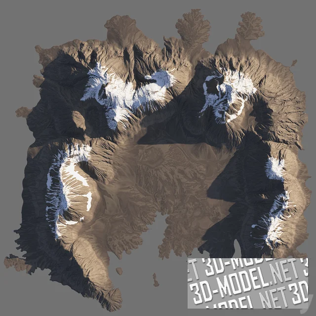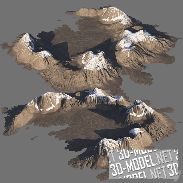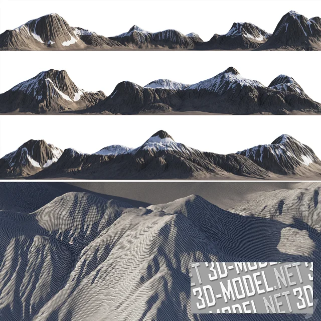 Горный ландшафт, цепочка гор, размещенных на кольце. Модель можно использовать для формирования дальнего плана в сценах компьютерных игр и прочих проектов. Шесть текстур (варианты разных сезонов и цвета) позволяют разнообразить внешний вид горной цепи.