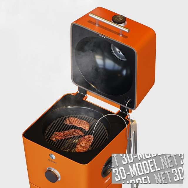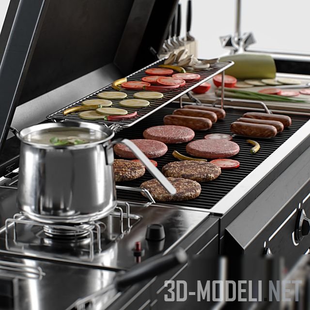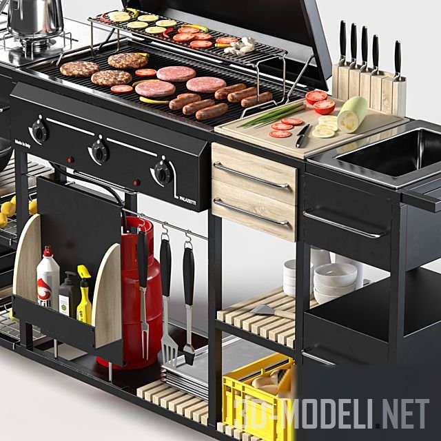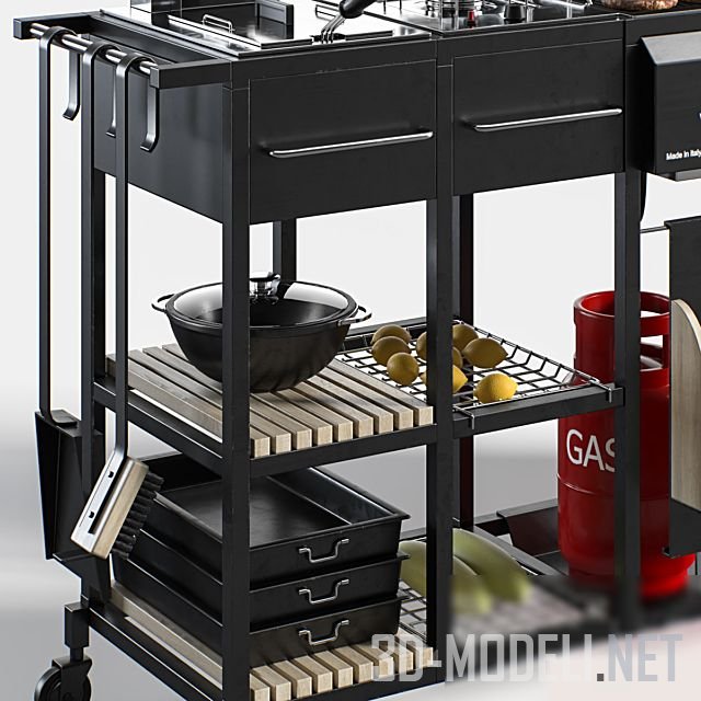 Современный мобильный гриль Кamado для террас загородных домов, с деревянным блоком на роликах, посудой, продуктами и аксессуарами. Сам агрегат - круглой формы в корпусе с крышкой и рельефной наружной поверхностью зеленого цвета, вмонтирован по центру деревянного стола. На решетке гриля - два куска зажаристого стейка. Кусок сырого мяса, приготовленный к жарке, лежит на белой круглой тарелке рядом. На столе: бутылки с пивом, специи, розмарин, лоток со льдом, тарелки, столовые приборы. Габарит блока: 227,86х86,48х155,41см.
