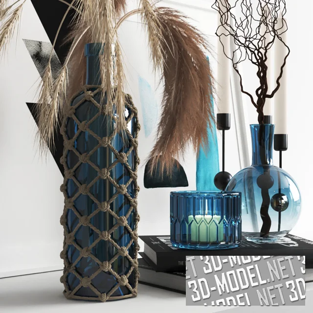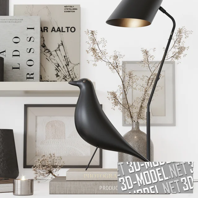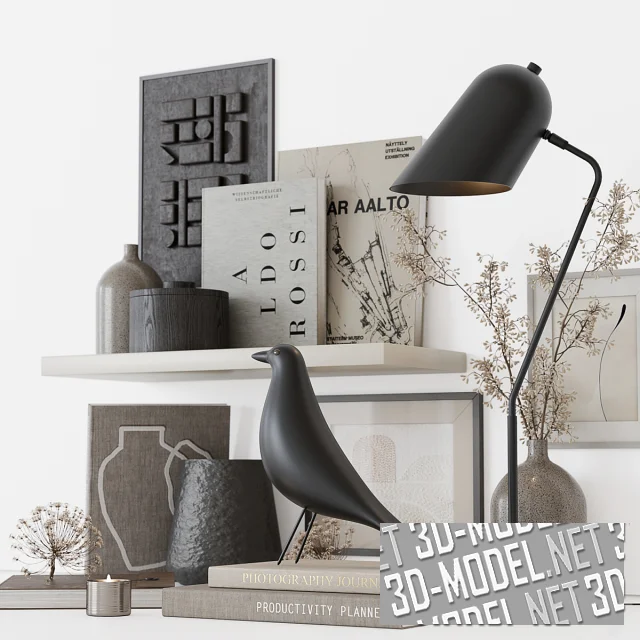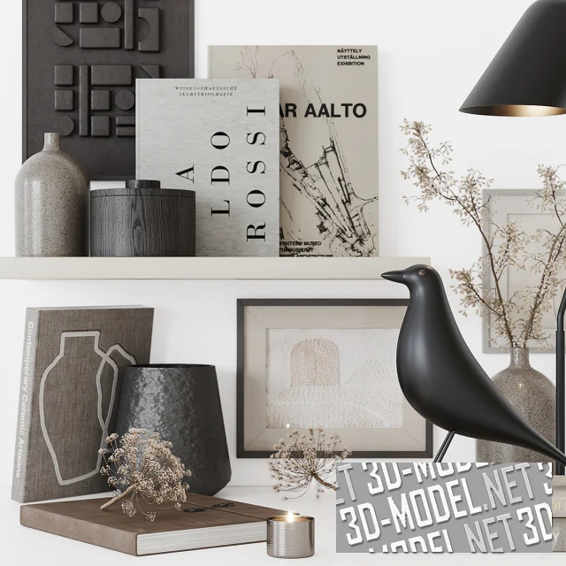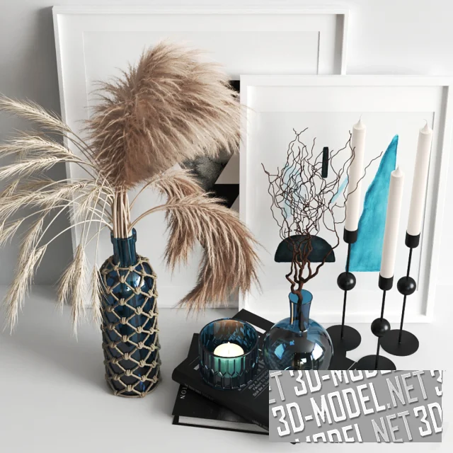 Элегантный набор современного интерьерного декора в сочетаниях розоватой меди и черного. В комплекте ребристая черная ваза с сухими, жемчужно-белыми растениями, круглые черные матовые минималистичные настольные часы, книги в черных обложках, черный керамический стакан, настольный светильник в виде черной турбины, аромо-диффузор с черными аромо-палочками в черном флаконе, очки в черной оправе, круглая серо-коричневая шкатулка, многогранный плафон для свечи с медным каркасом, семь маленьких чайных свечей в медных стаканчиках-«таблетках». Композиция выстроена на фоне настенного круглого зеркала в тонкой черной раме.