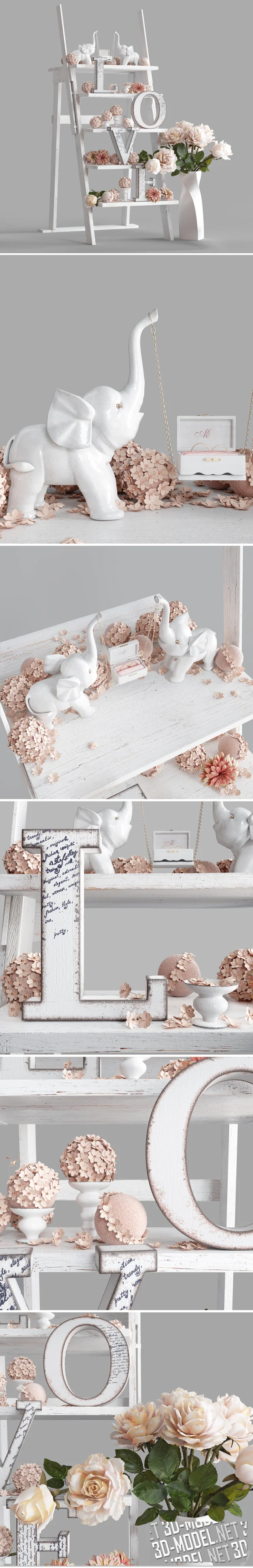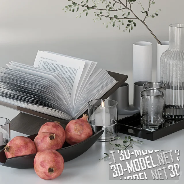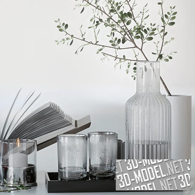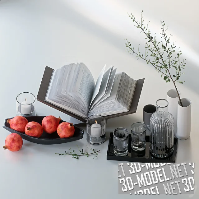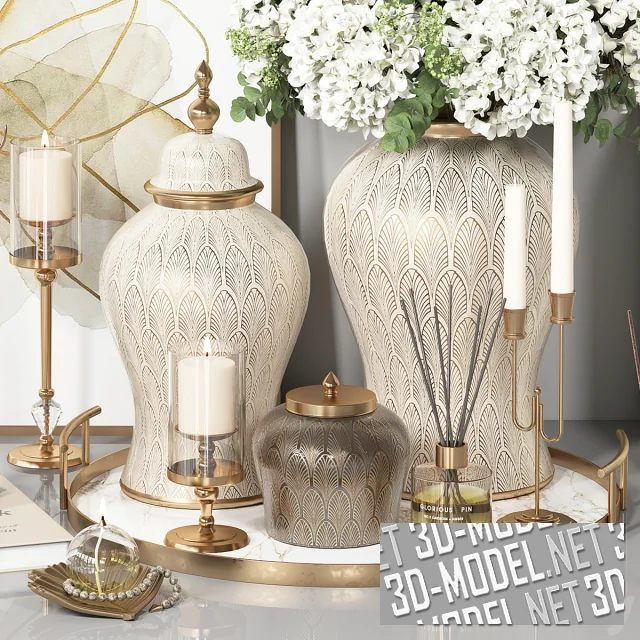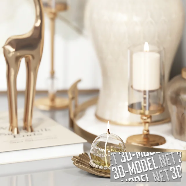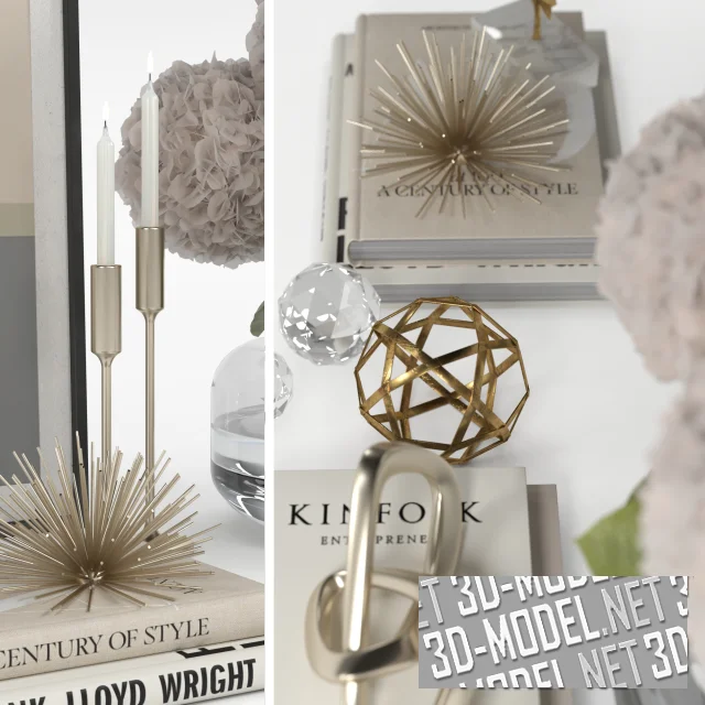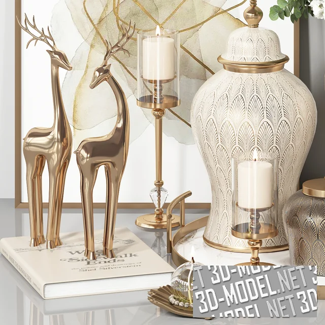В вазе букет из веток эвкалипта-цинереи и белых гортензий. Кроме этого на подносе аромодиффузор со стеклянным флаконом, золотистой крышечкой и аромо-палочками, латунный двойной подсвечник с тонкими белыми свечами и латунный подсвечник с толстой белой свечой за стеклянным цилиндром плафона. Также в наборе присутствуют книги в белых обложках, латунный стилизованный лист-подставка с ниткой бус и стеклянной сферой аромосвечи, высокий латунный подсвечник со стеклянным плафоном, две полированные золотистые фигурки оленей, аромопалочка на подставке и абстрактная картина в золотистой раме.