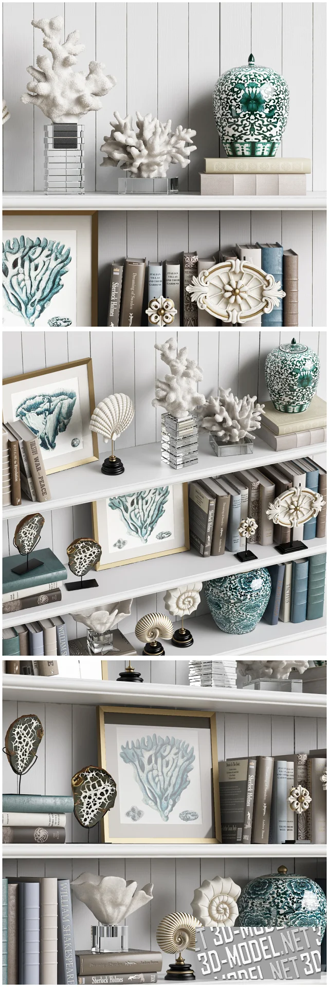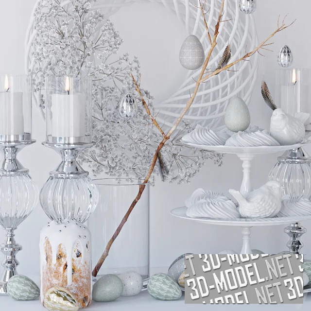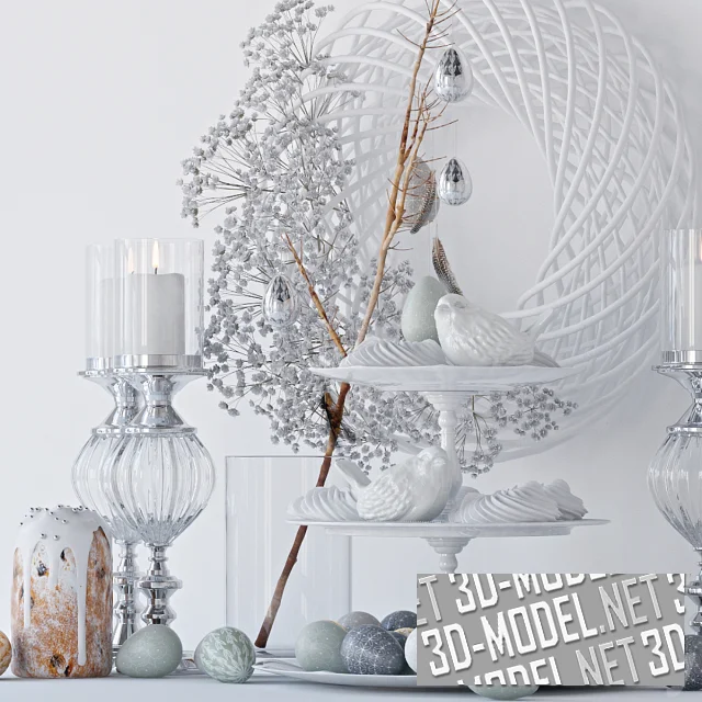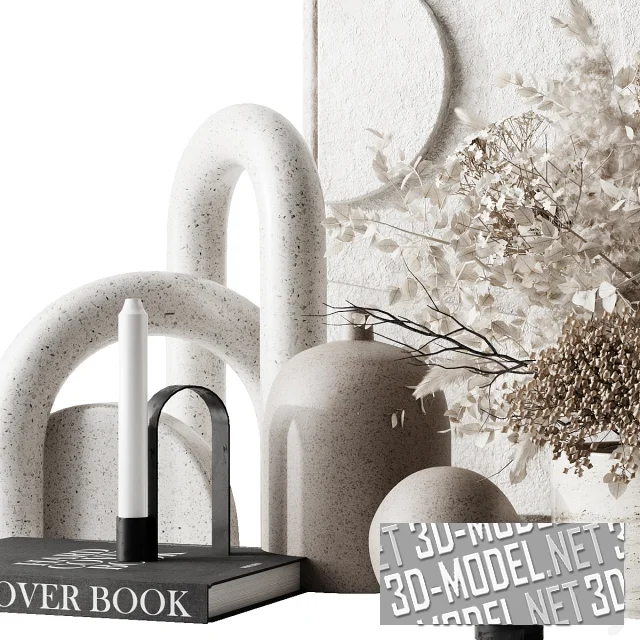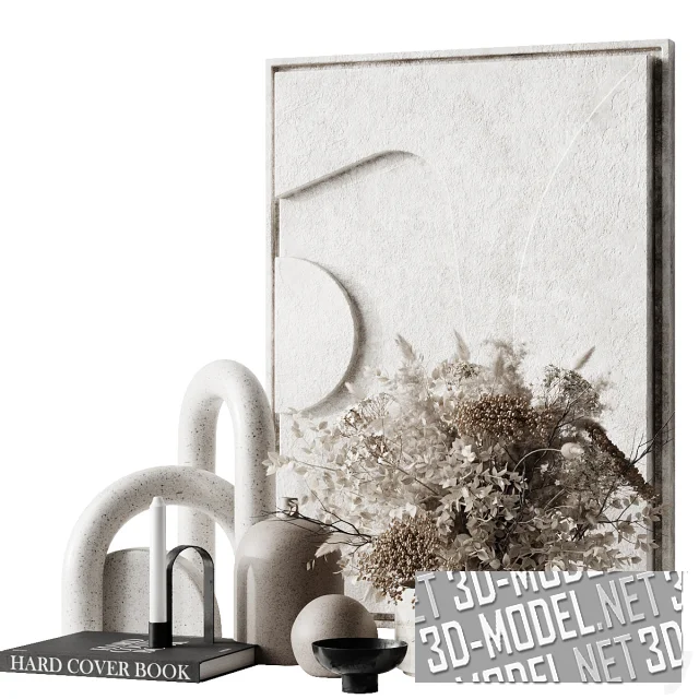 В композиции использованы два квадратных панно в тонких рамках. На одном песком создана текстура с хаотичными фигурными границами. На втором - рельефное абстрактное изображение с плавным переходом песочных оттенков от темного снизу, до белого вверху. Кроме вышеперечисленного в наборе: цилиндрическая ваза из прозрачного стекла с цветущими ветками, стеклянные банки с бежевыми свечами, книги в белых обложках, аромо-диффузор в стеклянном флаконе, настольная скульптура из светло-бежевого камня в виде двух звеньев цепи, круглая чаша на четырех ножках с наклонным срезом.
