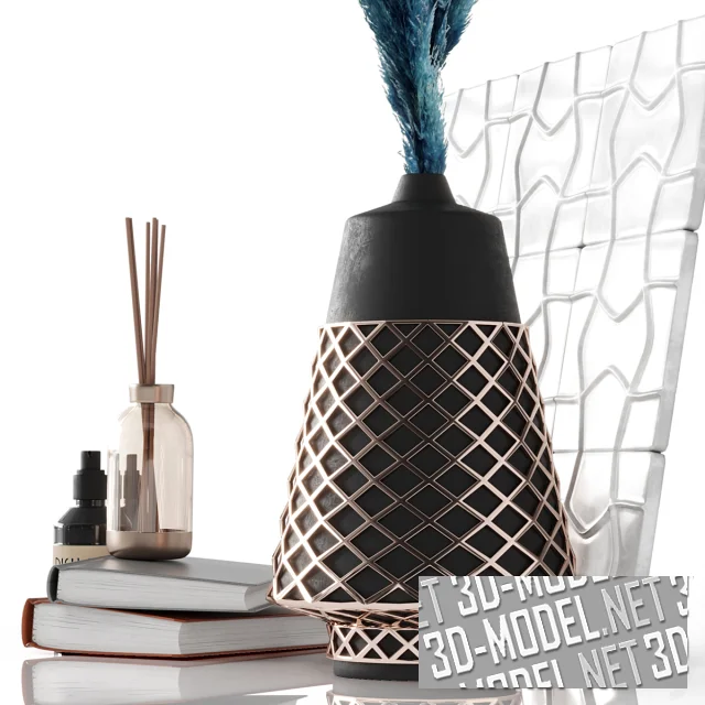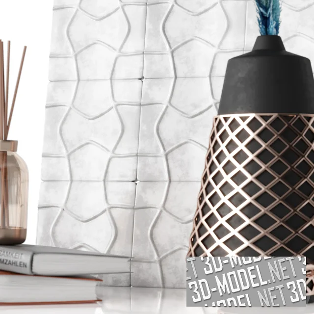 Набор современного интерьерного декора от Lotta Agaton. В комплекте керамическая ваза мятного цвета с глубоким прорезным геометрическим орнаментом из треугольников, в ней ветка с мелкими бордовыми листьями, металлический стакан с кельтским орнаментом, сухие шарики растений на черенках в стакане, низкополигональный матовый черный шар, тонкая белая многолучевая звезда, белая с черным бутылка для питьевой воды с небольшим ремешком для переноски, стакан, отделанный коричневым шпоном.