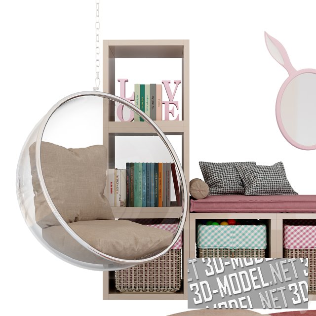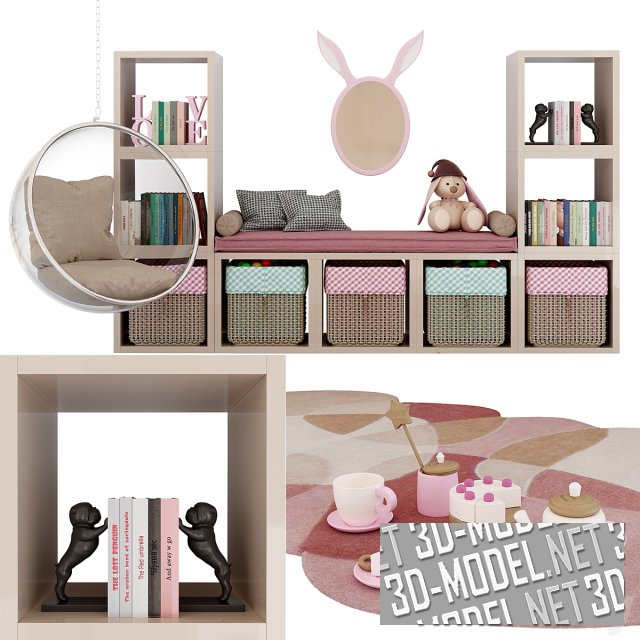 Современный набор мебели, игрушек и элементов декора для качественного и реалистичного наполнения детской комнаты для девочек. Об этом говорит преобладание нежно-розовой палитры. В основе набора – мебельная стенка со полками по бокам, со специальными отсеками для игрушек и других вещей внизу, и комфортным местом для отдыха посередине. Также в комплект входит подвесное кресло в форме полусферы с подушкой. Полки заполнены книгами, статуэтками и английскими буквами, чо образуют слово «Love». Над кроватью висит зеркало с милыми заячьими ушками розового цвета. На привлекатекательном коврики в форме нежного цветка – детский сервиз. Сейчас спустится с кровати заяц и приступит к чаепитию с тортиком!