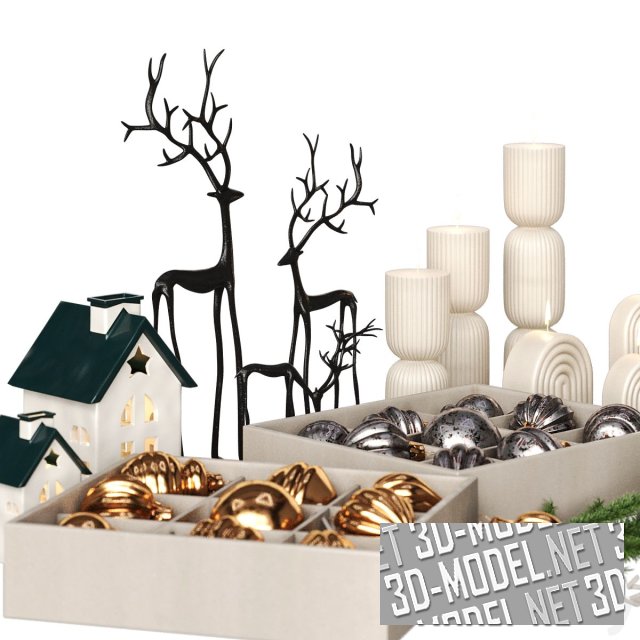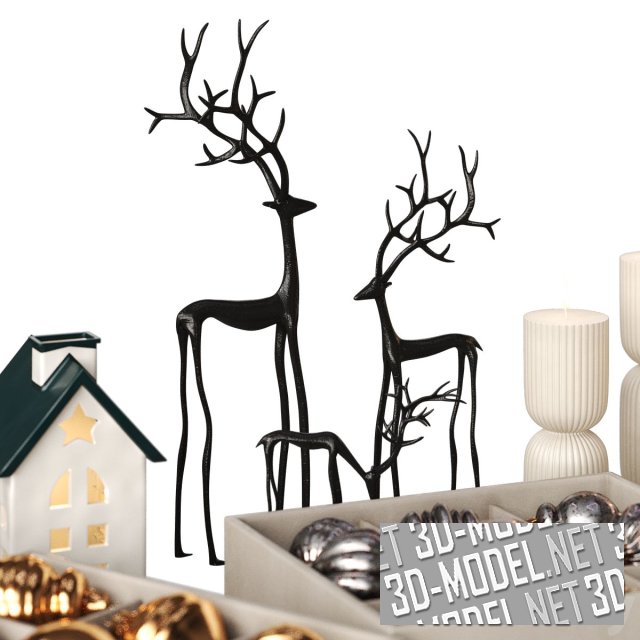 Красивая инсталляция для Рождества. В наборе две большие картонные коробки с елочными игрушками золотистого и серебряного цвета, тонкие изящные фигурки оленей черного глянцевого цвета, а также два маленьких домика со светящимися окнами, фигурные свечи и подос с палочками корицы на еловой ветке.