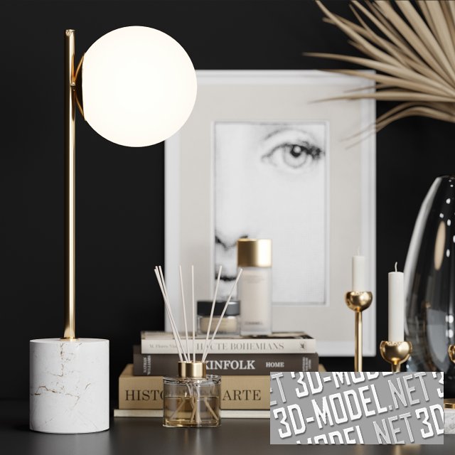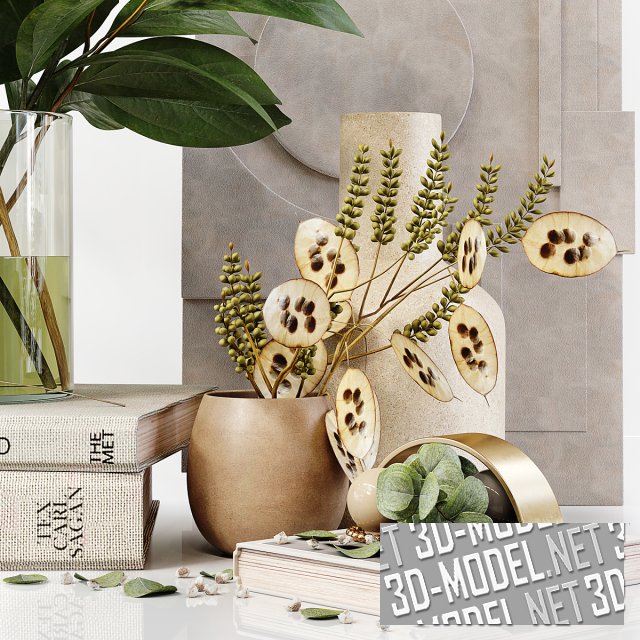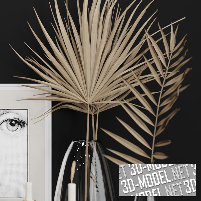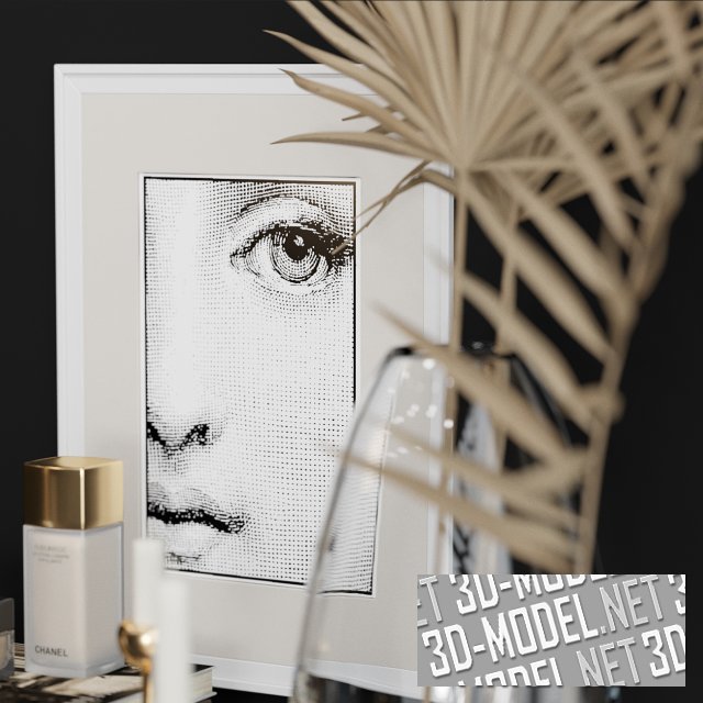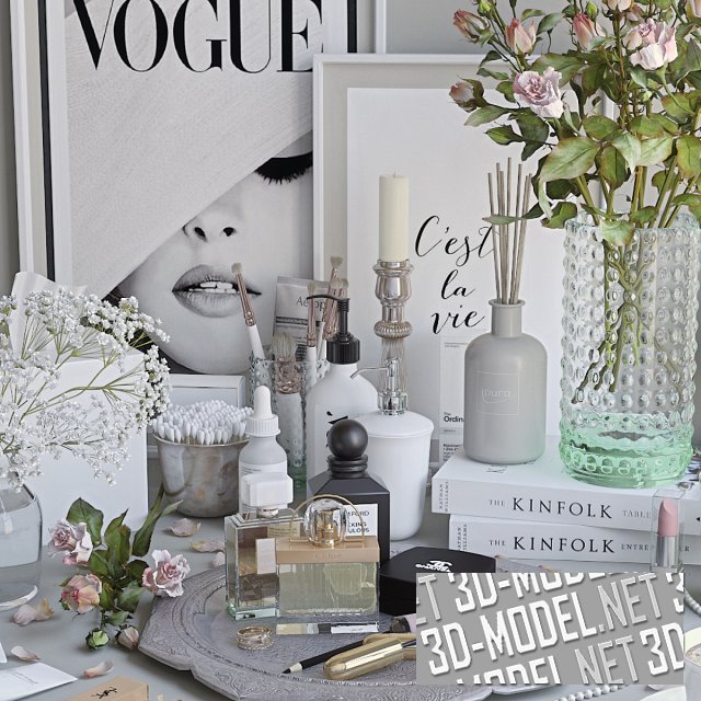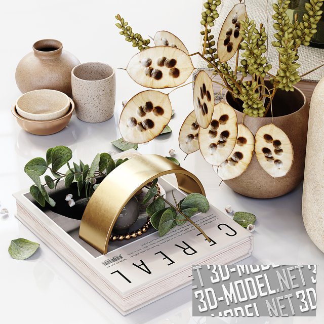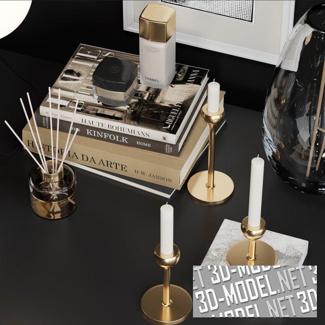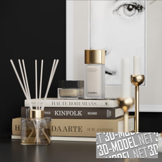 Необычный декоративный набор, который состоит из различных предметов от бренда West Elm. В сцену также включены: косметика Chanel, книги и ветки сухой пальмы. Все это создает гармоничную картину для современного интерьера.