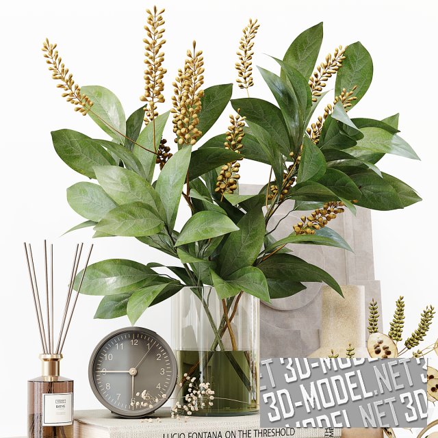 Букет из ветвей лаврового дерева, веточка лунарии и небольшая гипсофила в интерьерной композиции из предметов декора. Кроме букета в прозрачном стеклянном сосуде и лунарии в керамическом стакане на столе расставлены: керамический кувшин песочного цвета, книги в светлых обложках, круглые настольные черные часы, стеклянный аромодиффузор с палочками, керамические плошки нескольких видов, золотистые бусы. В композиции разместилась также абстрактная барельефная скульптура из декоративного бетона, с супрематическим мотивом.