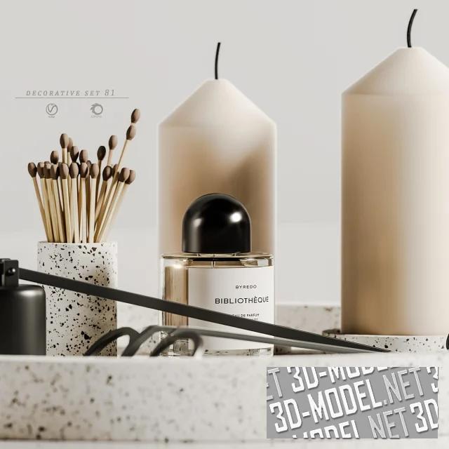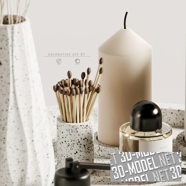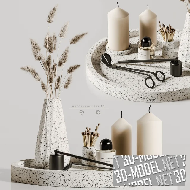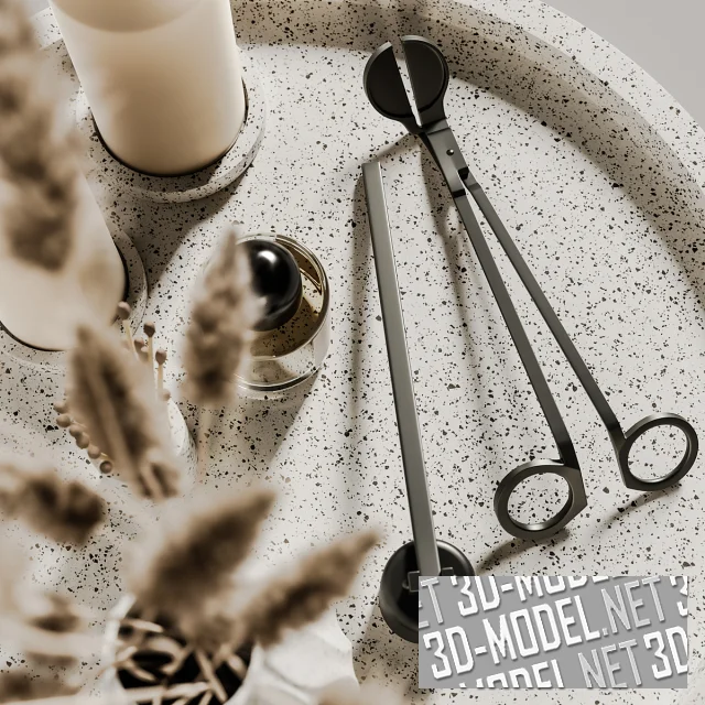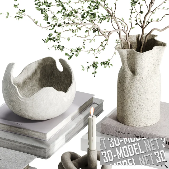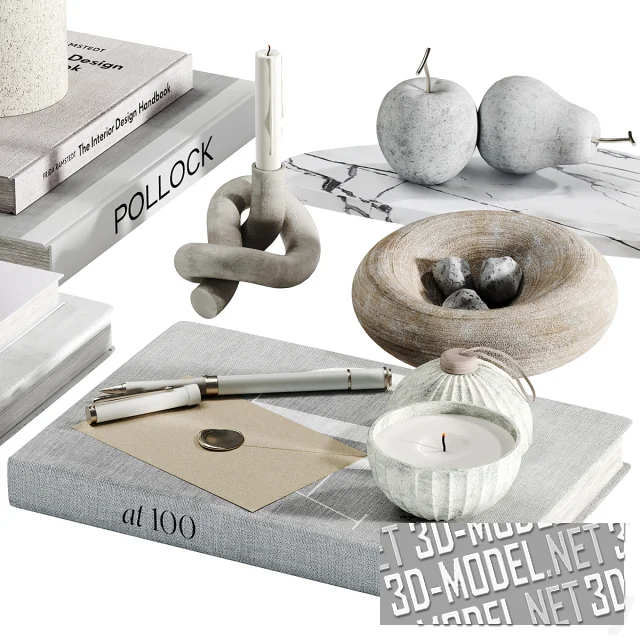 Современный интерьерный декор для размещения на столе, с элементами в светлых тонах. В наборе белая керамическая ваза с рустикальной поверхностью и волнистой кромкой, ветки в вазе, керамическая полусфера со сбитой верхушкой с криволинейной кромкой, подсвечник в виде узла, толстое круглое каменное блюдце с несколькими камнями, аромо-свеча в оригинальном рельефном сосуде с крышкой, книги в светлых обложках, белая шариковая ручка, криволинейный поднос из белого с черными прожилками мрамора. На подносе два реалистичных фрукта (яблоко и груша) из искусственного камня.