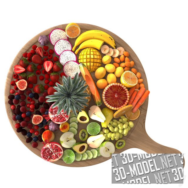 Огромный «витаминный» натюрморт на большой разделочной круглой деревянной доске с ручкой. Фрукты, овощи и ягоды на доске - целиком и в нарезке. В центре возвышается плод ананаса. Вокруг: кумкват, морковь, апельсин, лимон, грейпфрут, банан, долька дыни, груша, виноград, яблоки, авокадо, огурец, гранат, инжир, клубника, персик, питайя, малина, личи, вишня, голубика, киви. Габарит композиции: 52,75х62,8х28,4см.