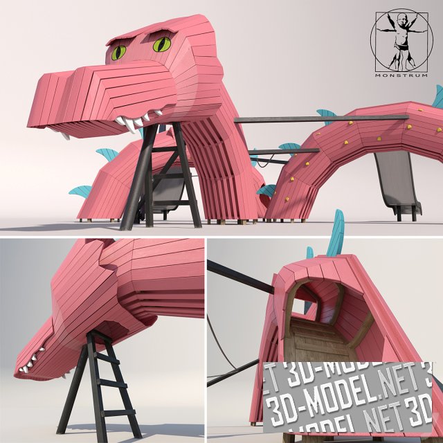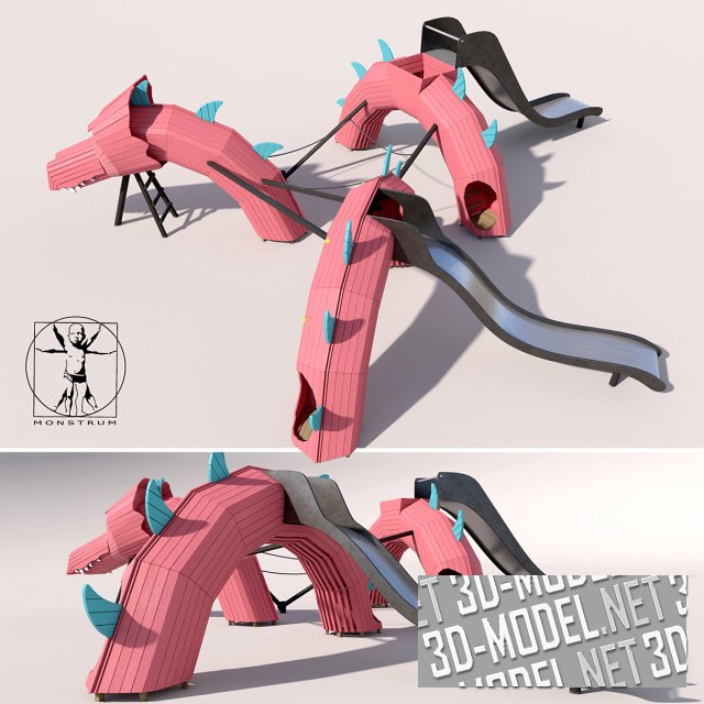Большой современный комплекс для веселых игр на детских площадках. Что может быть интереснее для ребенка, как не возможность забраться куда повыше и съехать с ветерком вниз? В этом помогут большие винтовые горки с туннелями и без них, высокие крутые лесенки и канатные дорожки. На рендере можно увидеть силуэты людей. Все это сделано для того, чтобы лучше понимать масштабность сцены. Диаметр площадки – 20 метров.
