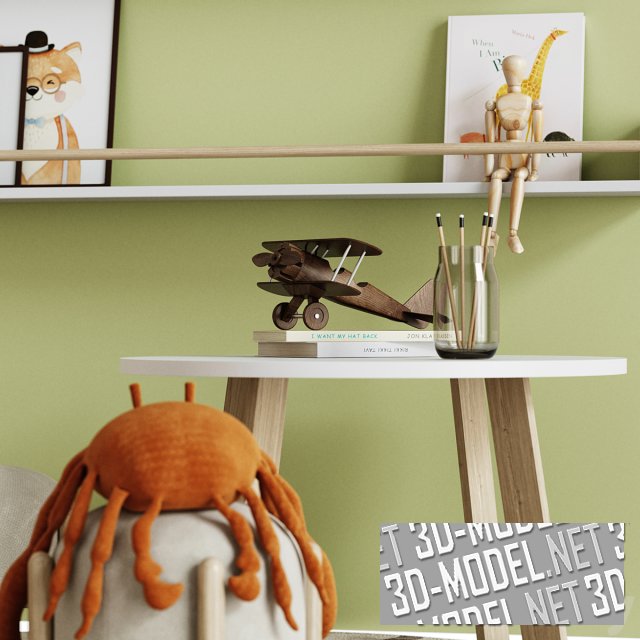 На круглом коврике круглый стол с белой столешницей, пара пуфов на деревянных ножках. На столе и пуфиках деревянная модель биплана, стеклянная банка с карандашами, книги, мягкий игрушечный краб оранжевого цвета. Рядом стоит цилиндрическая корзина с мягкими игрушками. На боковой плоскости корзины нанесена забавная мордочка. В наборе деревянная тележка с мягким серым игрушечным кашалотом.