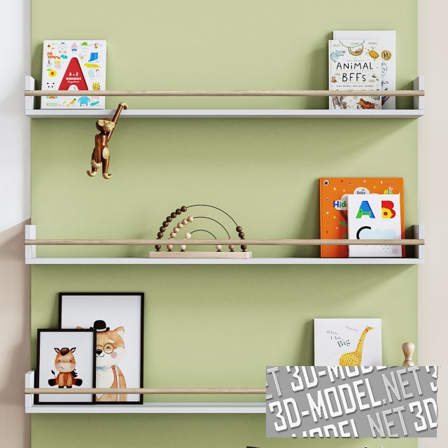 Набор декора, игрушки и стеллаж на арочной панели для современной детской комнаты в бежево-фисташковых тонах. Фрагмент стены за арочной панелью расписана криволинейными пятнами фисташкового, бежевого и белого цветов. На белых полках с бортиками из деревянных горизонтальных стержней расположились книги, черные фоторамки с рисунками для детей, деревянная модель человечка на шарнирах для художников, деревянная обезьянка и деревянная «радуга» с бусинками.