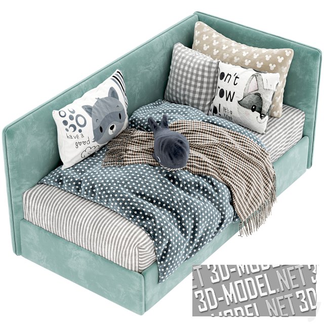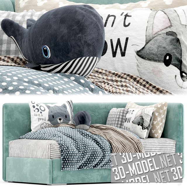 Корпус кровати и прямоугольное мягкое изголовье обиты светло-серым текстилем. Плоскость изголовья декорирована двумя горизонтальными прострочками, делящими панель на три равные части. Пестрые плоскости постельного белья с мелкими принтами на тему экзотических животных и растений хорошо сочетаются с элементами белого цвета и в мелкую бирюзовую полоску. Рельефная круглая темно-бирюзовая подушка с втяжкой-пуговкой служит цветовым акцентом в композиции. Поверх теплого одеяла наброшен серый плед с крупными пушистыми помпонами на кромке.